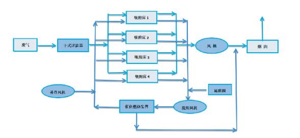 Adsorptionstankens specifikationer og adsorbentbelastningsmængden er designet i henhold til luftvolumen for at sikre en vis gashastighed og opholdstid, således at adsorbenten effektivt og fuldt ud kan absorbere det organiske opløsningsmiddel i restgassen. Adsorptionstanken fungerer skiftevis, og adsorptionstankens arbejdstilstand skiftes automatisk af PLC's automatiske kontrolsystem for skiftevis at udføre de tre processer med adsorption, desorption, afkøling og tørring og så videre.